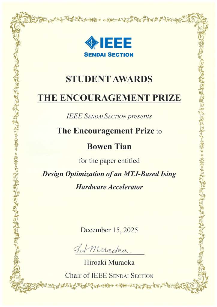 新概念VLSIシステム研究室(羽生・夏井・鬼沢研究室)のBowen Tianさん(博士前期課程1年)が IEEE Sendai Section・Student Awards”The Encouragement Prize”を受賞