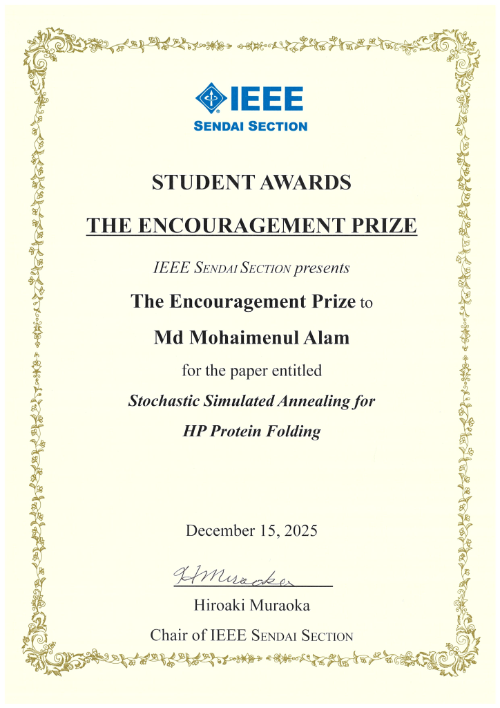 新概念VLSIシステム研究室(羽生・夏井・鬼沢研究室)のMd Mohaimenul Alamさん(博士前期課程1年)が IEEE Sendai Section・Student Awards”The Encouragement Prize”を受賞
