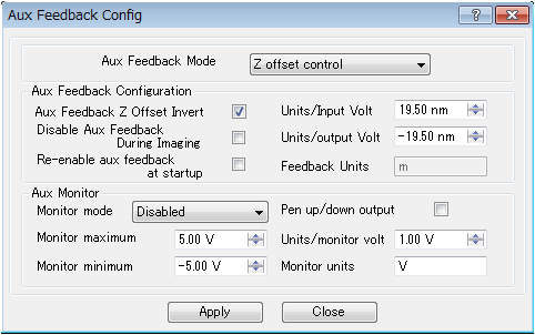 1. フィードバックをかけたまま,チューブスキャナのZ方向のオフセット電圧をゆっくり(※1)と調整し,チューブスキャナが伸びた状態,すなわちZ変位がプラスになるようにする(※2).例えば,+10V程度になるように調整する(※3).